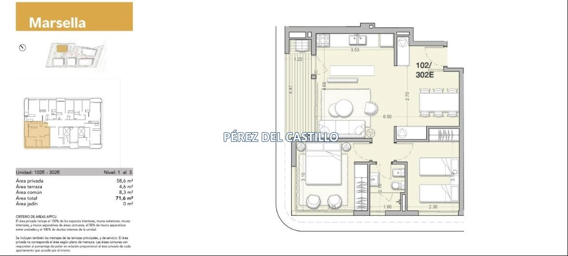 * Las superficies de los apartamentos incluyen muros divisorios hasta su eje, ductos, terrazas, balcones, prorrateo de área común, circulación vertical exclusivamente de planta.
