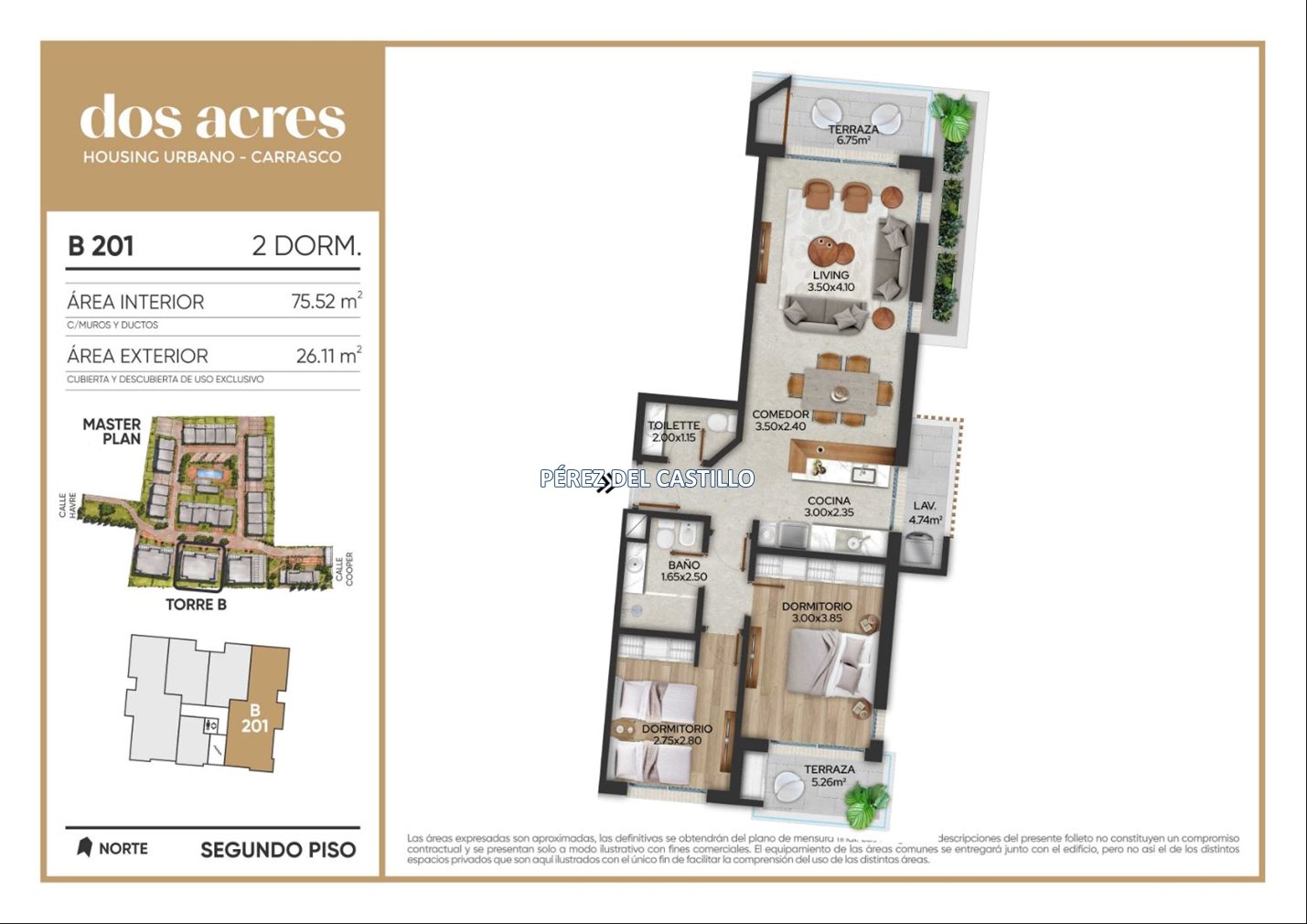 * Las superficies de los apartamentos incluyen muros divisorios hasta su eje, ductos, terrazas, balcones, prorrateo de área común, circulación vertical exclusivamente de planta.