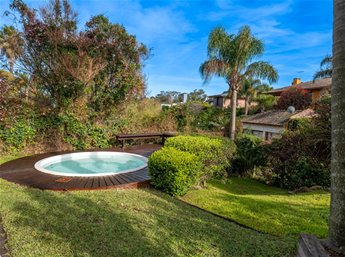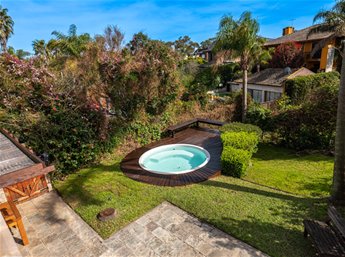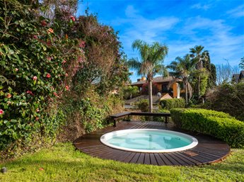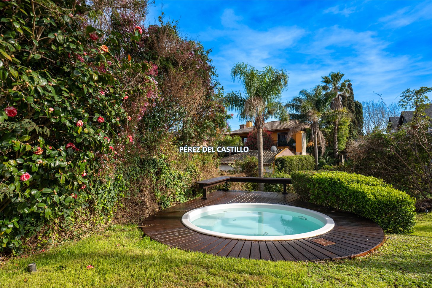Jardín orientado al norte con parrillero y piscina/jacuzzi.