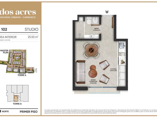 El proyecto inspirado en los barrios suburbanos de las grandes ciudades del mundo que cuanta con apartamentos de uno, de dos y de tres dormitorios, así como casas de tres dormitorios de distintos tamaños. Construcción con bloques de hormigón celular, paredes interiores de mampuesto o steel frame. Pisos de las unidades en porcelanato, y en dormitorios vinílicos símil madera, zócalos blancos, barandas de aluminio y vidrio. Cortinas de enrollar en dormitorios, cristales dvh. Losa radiante de agua con cronotermostato, gas por cañería previsión en una caldereta de ACS, estufa de alto rendimiento, previsión para instalación de anafe a gas y horno eléctrico. El complejo tendrá monitoreo 24 horas, cámaras analíticas y sensores inteligentes para detección de movimientos.