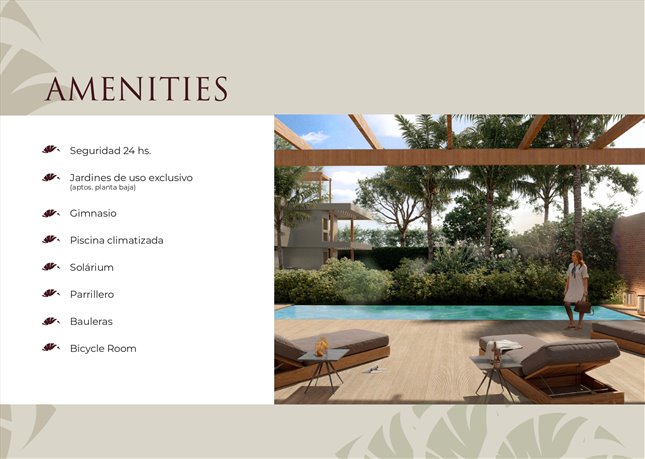 Cuanta con varios amenities: Gimnasio en subsuelo. Piscina exterior climatizada mediante bomba de calor. Estacionamiento cerrado para bicicletas. Pérgola de madera natural. Seguridad 24 horas. Espacios verdes comunes.